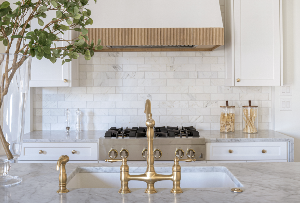 Kitchen backsplashes paired with natural wood or brass